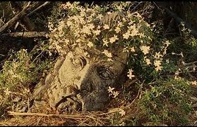 The eyes were hollow and the carven beard was broken, but about the high stern forehead there was a coronal of silver and gold. A trailing plant with flowers like small white stars had bound itself across the brow as if in reverence for the fallen king, and in the crevices of his stony hair yellow stonecrop gleamed.